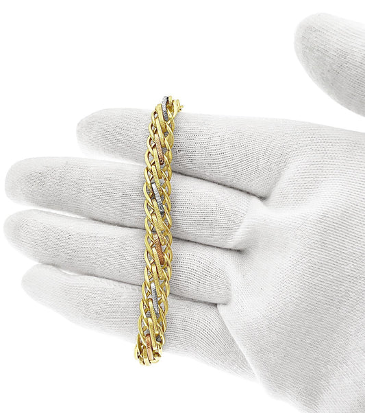 14k Tri Color Gold Wheat Polished and Textured Link Bracelet 8mm 8 inch
