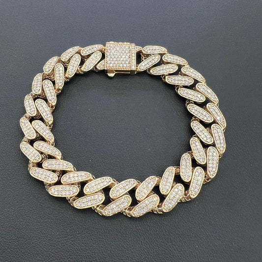 10mm Curb Cuban Link Pave Chain Bracelet 10k Yellow Gold