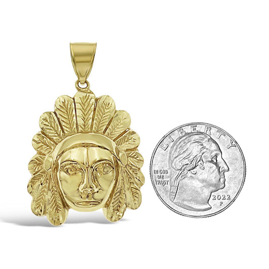 Native Indian Head Pendant 10k Yellow Gold Charm 1.8"