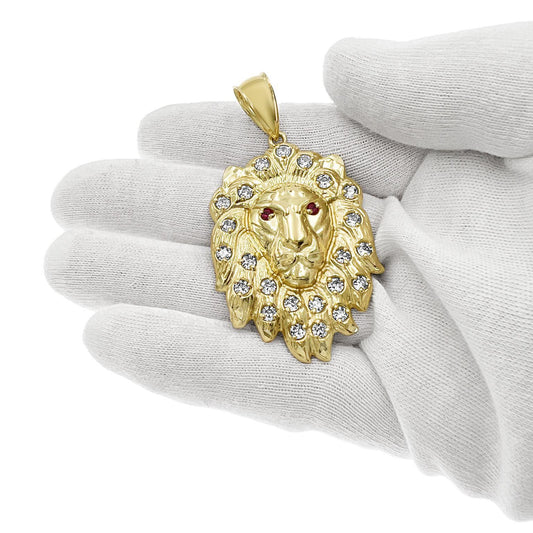 Lion Head Charm Pendant 10k Yellow Gold CZ Simulated Ruby 2.5 inch