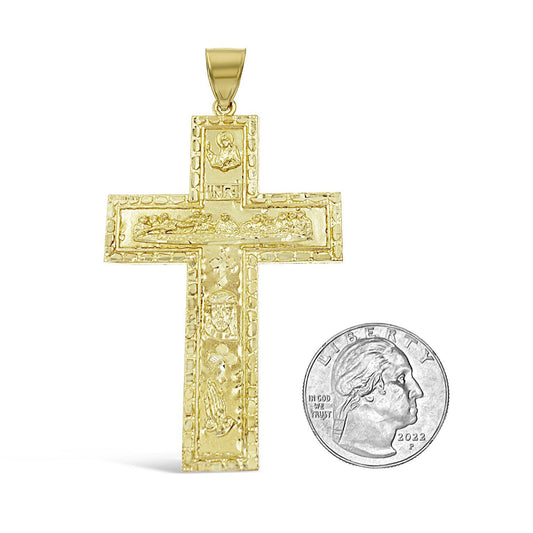 10k Yellow Gold Large Cross Jesus Last Supper Mens Pendant Charm 3 inch