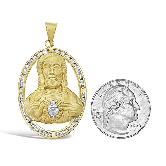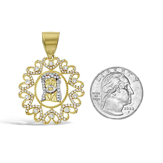 14K Two Tone Gold Jesus Head Heart Frame Pendant With CZ Religious Charm 1.6 in