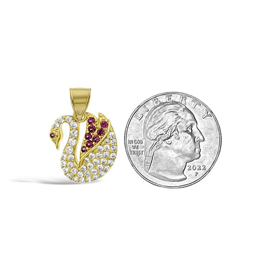 14K Yellow Gold Swan Pendant White & Red CZ Stones Animal Bird Jewelry 0.9 inch