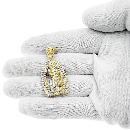 14K Yellow White Gold Saint Barbara Pendant CZ Religious Mens Charm 1.5 inch