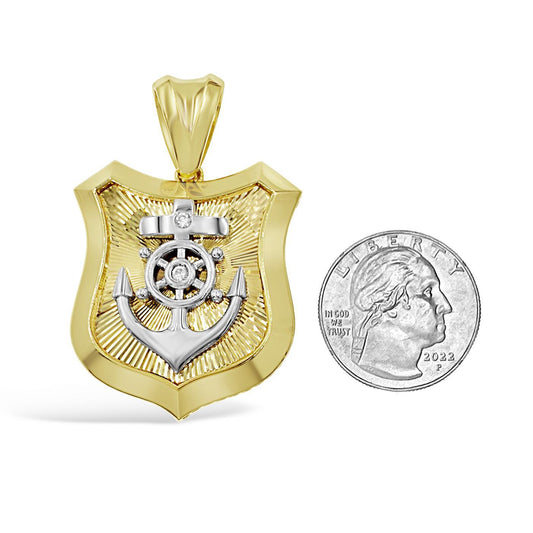 14K Two Tone Gold Mens Anchor Wheel Shield Pendant Nautical Charm 2 inch