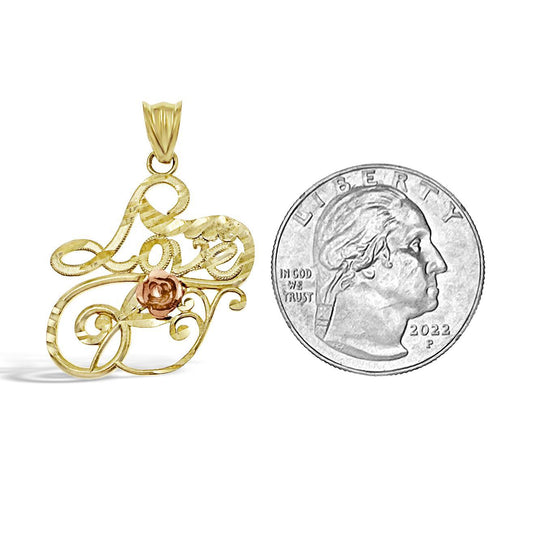 10k Yellow Gold Love Pendant with Rose Flower Design Script Letter