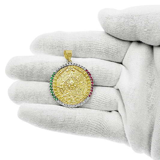 10K Yellow Gold Aztec Calendar Pendant Round Mexico Flag Colors Charm 1.4 inch