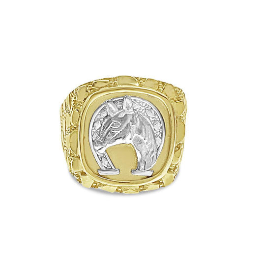 Lucky Horseshoe Horse Nugget Mens Signet Pinky Ring 10k Two Tone Gold