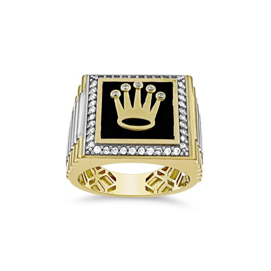 10k Two Tone Gold Mens Crown Signet Ring Black Enamel CZ