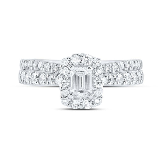 0.97ctw Emerald Diamond Halo Bridal Wedding Ring Set 14k White Gold