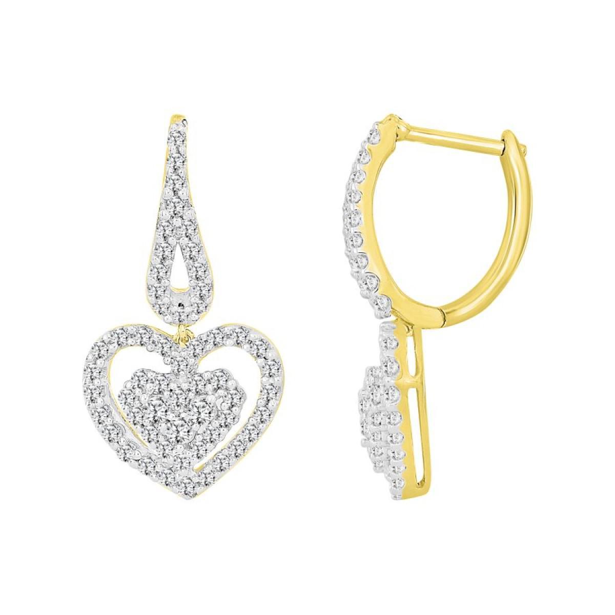 0.75cttw Round Diamond Double Heart Hoop Drop Huggie Earrings 10k Yellow Gold
