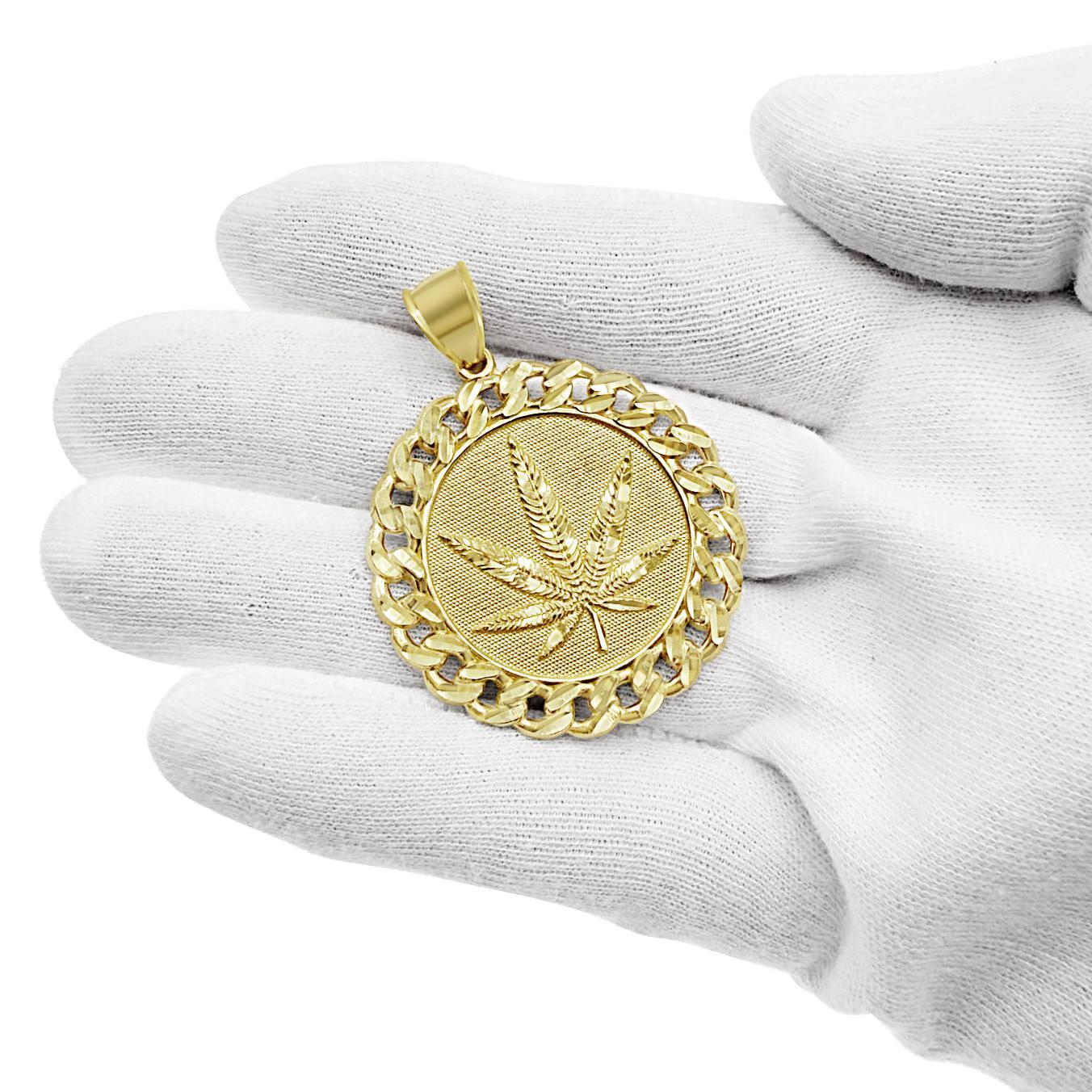 10K Yellow Gold Marijuana Leaf Mens Round Pendant