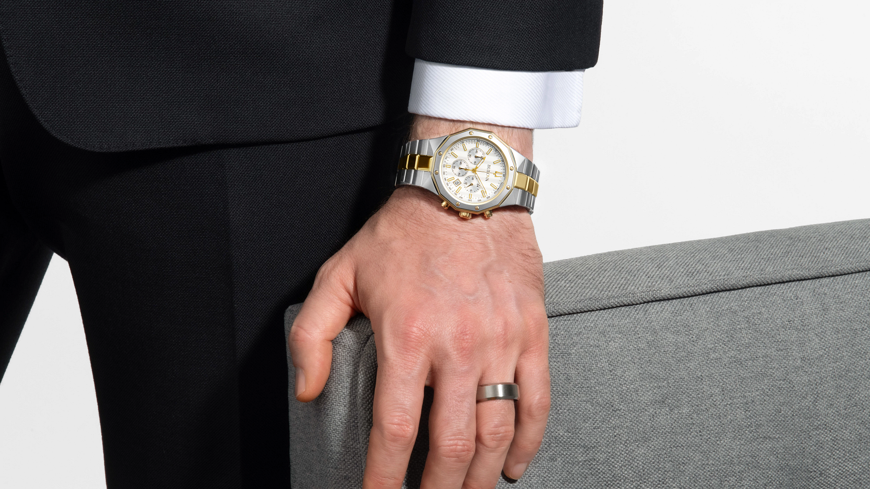 Bold, modern design characterizes this 6-hand chronograph from the Classic Bulova Prestige men’s collection. The watch features a faceted 40mm gold- and silver-tone stainless steel case with a geometric bezel, flat sapphire crystal with anti-reflective coating, 100m of water resistance, and a chamfered 3-link bracelet with a combination of brushed and polished finishes and a push-button deployant closure. The silver-white striped dial has gold-tone hands and applied markers with Super-LumiNova luminescent fill, a date display, and sub-dials including a 24-hour display. Highly functional with a distinctive design, this timepiece is suited for any occasion, from the everyday to the extraordinary.