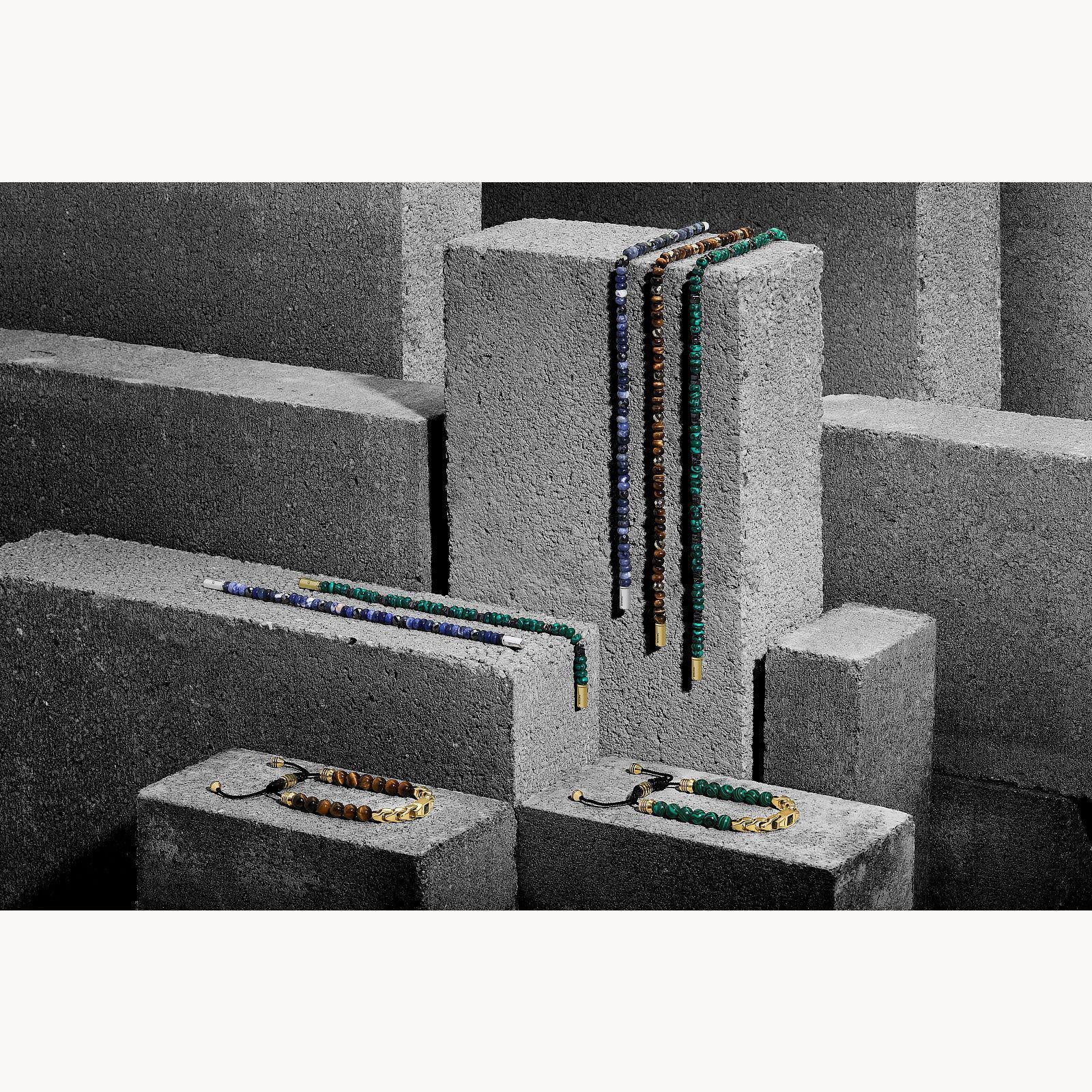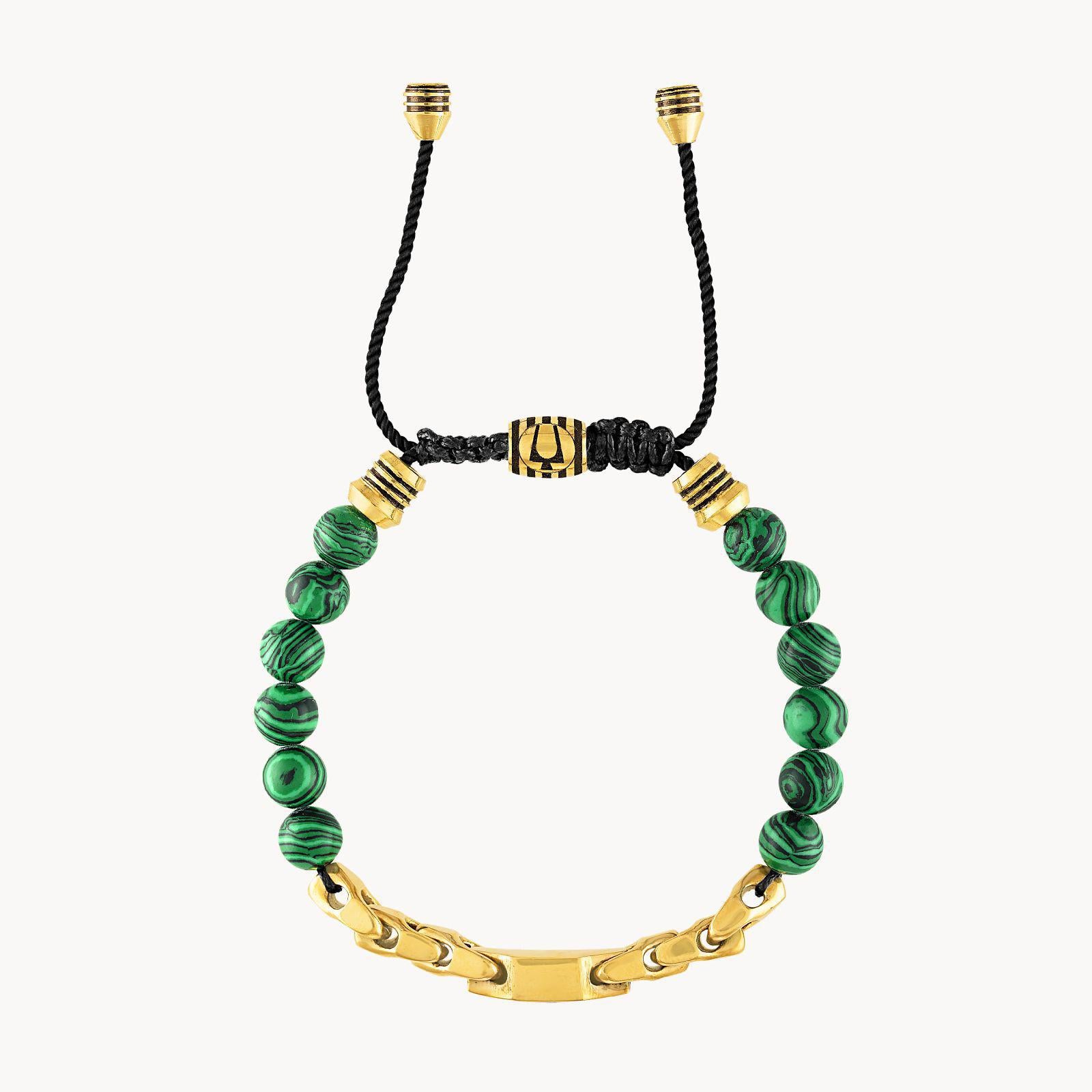 An adjustable beaded bolo bracelet features a center motif of faceted black spinel, a rare gemstone believed to repel negativity while providing inspiration and empowerment. Surrounded by beads of malachite, a stone of transformation, luck and prosperity. The tuning fork shaped Bulova Links in front and decorative striped accent beads in back, both in gold-tone stainless steel. Black cord with an etched logo sliding clasp adjusts easily for a comfortable fit. 8MM beads.