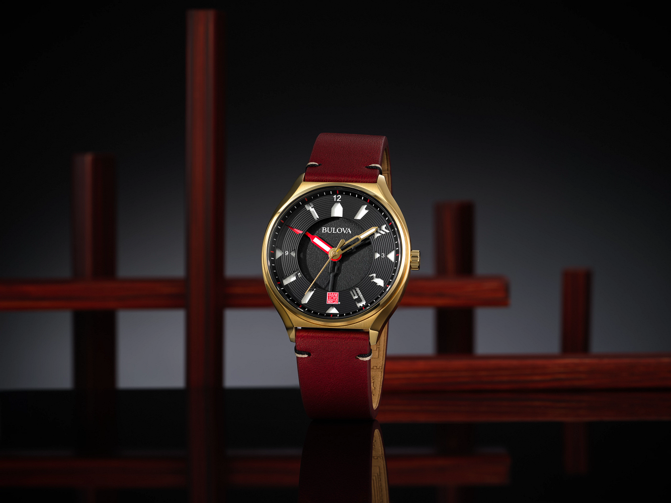 Paying tribute to the legacy of one of America’s greatest architects, this Bulova men’s timepiece from the Frank Lloyd Wright collection celebrates the iconic architect’s Usonian homes. USONIA—a name derived from “United States of North America”— was the term Frank Lloyd Wright coined to describe his vision for a new affordable architecture that freed itself from European conventions and responded to the American landscape. Wright built around 60 Usonian homes and designed upwards of 140. The majority of these homes came with their own unique geometric elements utilized in clerestory windows, laylights, furniture, upholstery, and more. This collector’s watch features a 40mm gold-tone stainless steel case with a sapphire crystal with anti-reflective coating and a rich burgundy leather strap, evoking the warmth of the Usonian aesthetics. The black dial is constructed in multiple layers with cutout markers inspired by the perforated clerestory panels in Usonian homes revealing a luminous white Super-LumiNova layer beneath, as well as red and gold hour hands and an additional hour indicator in Wright’s signature red, highlighting the current hour. The watch is powered by an automatic movement with 21 jewels and a power reserve of 42 hours. Honor the legacy of the unique works of one of America’s greatest architects with this Bulova men’s Frank Lloyd Wright watch, offered in a Bulova signature box with a special Frank Lloyd Wright storybook.