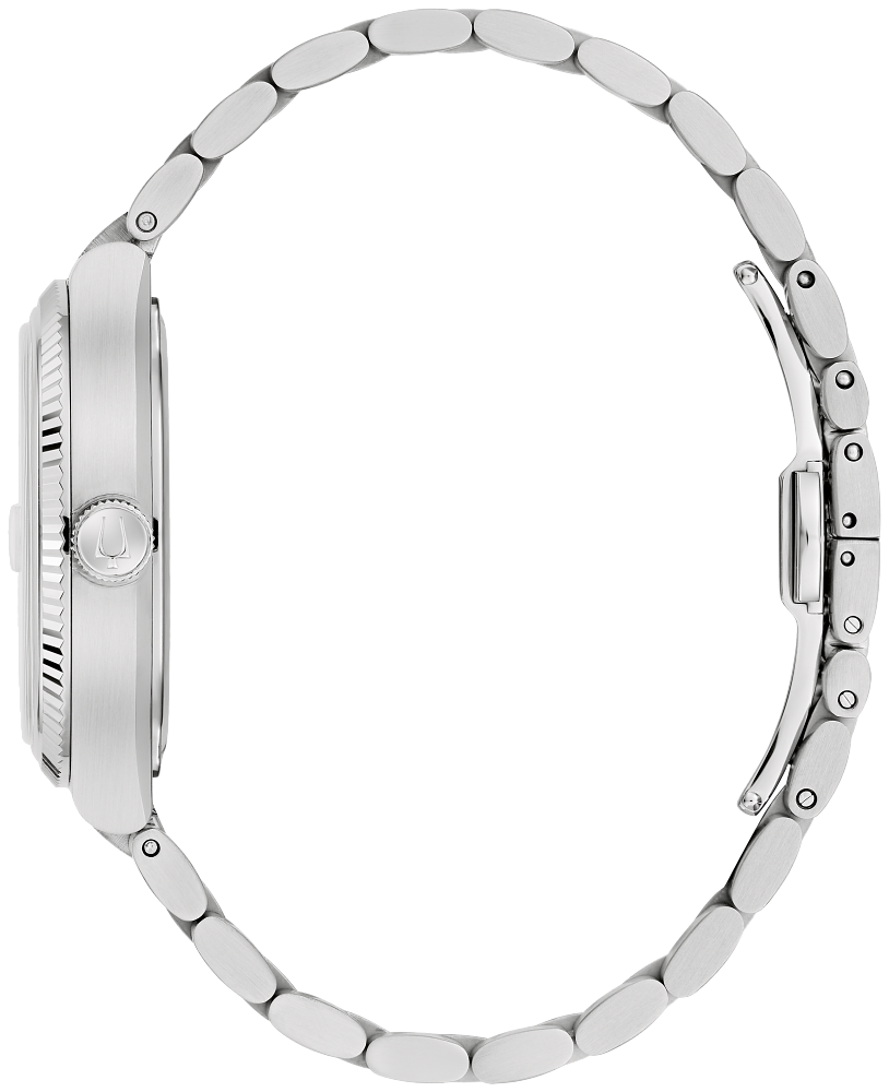 Drawing inspiration from the incredible Bulova Super Seville Day-Date from the 1970s, the new Super Seville merges retro aesthetics with state-of-the-art Precisionist technology for a timeless modern appeal. The silver-tone stainless steel 38mm case has the versatility to be worn by most anyone and makes a bold statement with a seamless silhouette created by the retro TV-shaped case transitioning into the integrated 3-link stainless steel bracelet, which features a secure and convenient push-button deployant clasp. An elegant, grooved coin edge bezel enhances the case and surrounds the flat sapphire crystal and its date magnifier. The compelling dial is a deep vertical brushed blue, with polished hands and indices and a date situated perfectly at 3 o’clock. The new Bulova Super Seville is powered by our proprietary high precision quartz Precisionist movement, a revolutionary 8-jewel quartz mechanism vibrating at a remarkable 262kHz, accurate to seconds per year with increased resistance to temperature changes, and with a smooth sweeping second hand. Embrace an effortless kind of elegance with the men’s Bulova Super Seville.