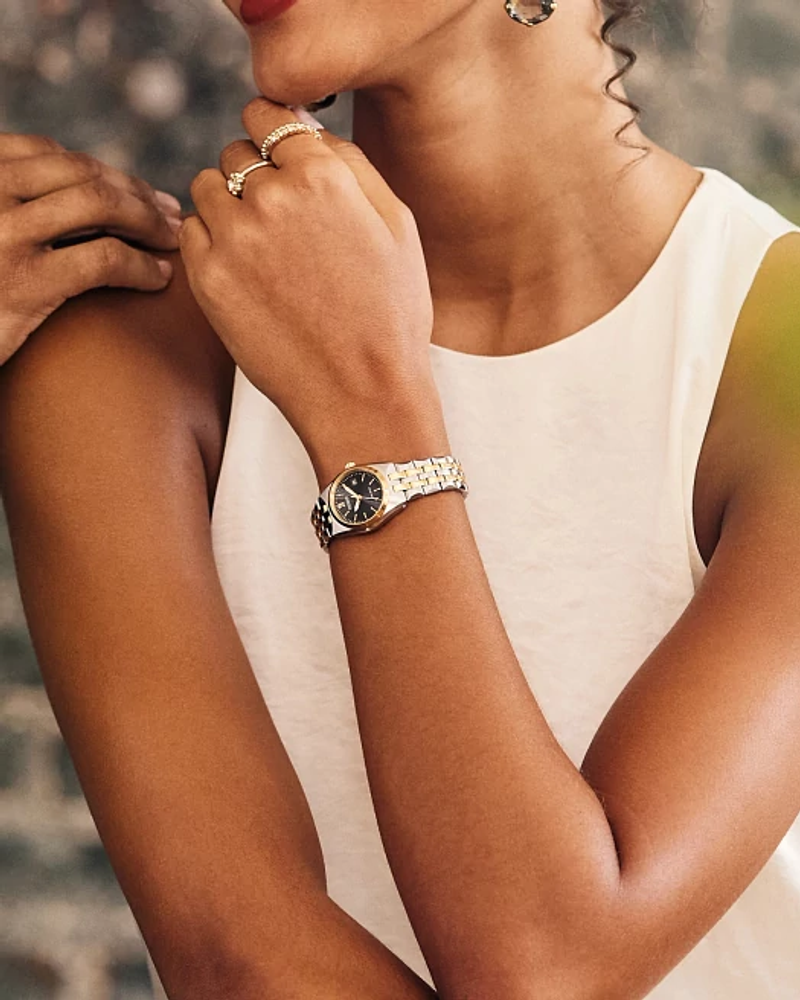 A classic timepiece is always in style in the Corso women’s timepiece from Citizen. Featuring a two-tone gold and silver-tone stainless steel bracelet and case with a 3-hand black dial and date indicator, luminous hands and gold-tone markers. This elegant timepiece also features a fold-over clasp closure with hidden push buttons and is water resistant to 100 meters. If you’re looking for a dress watch to add effortless style to your wardrobe, the Corso is the perfect choice. It also uses Citizen’s proprietary Eco-Drive technology, so it is sustainably powered by any light and will never need a battery.